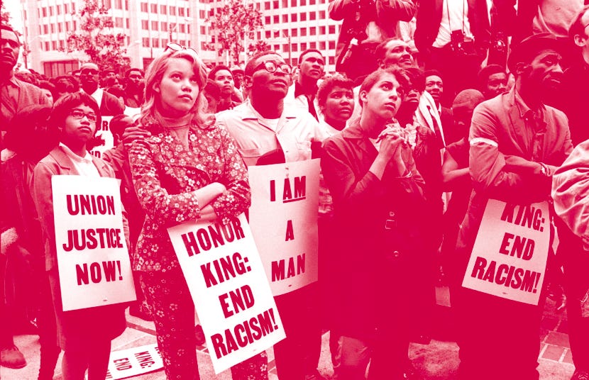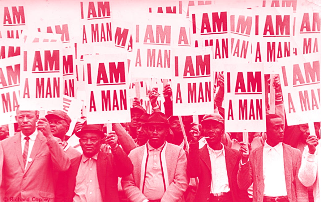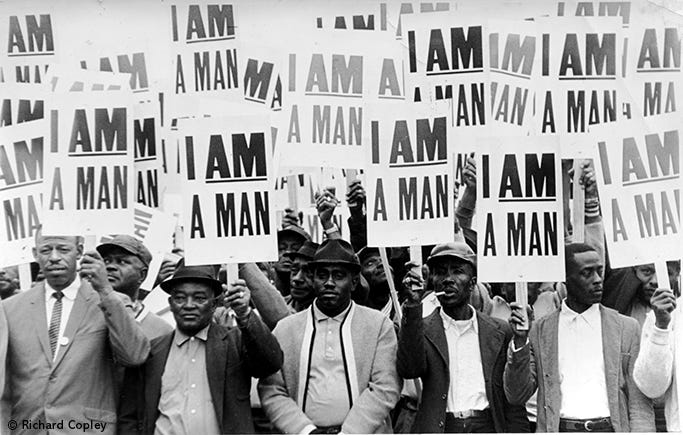 A group of demonstrators holding signs reading ‘Union Justice Now’, ‘Honor King: End Racism!’ and ‘I Am A Man’ march in protest soon after the assassination of Dr. Martin Luther King, Jr., Memphis, TN, April 1968. (Photo by Robert Abbott Sengstacke/Getty Images) Learn More